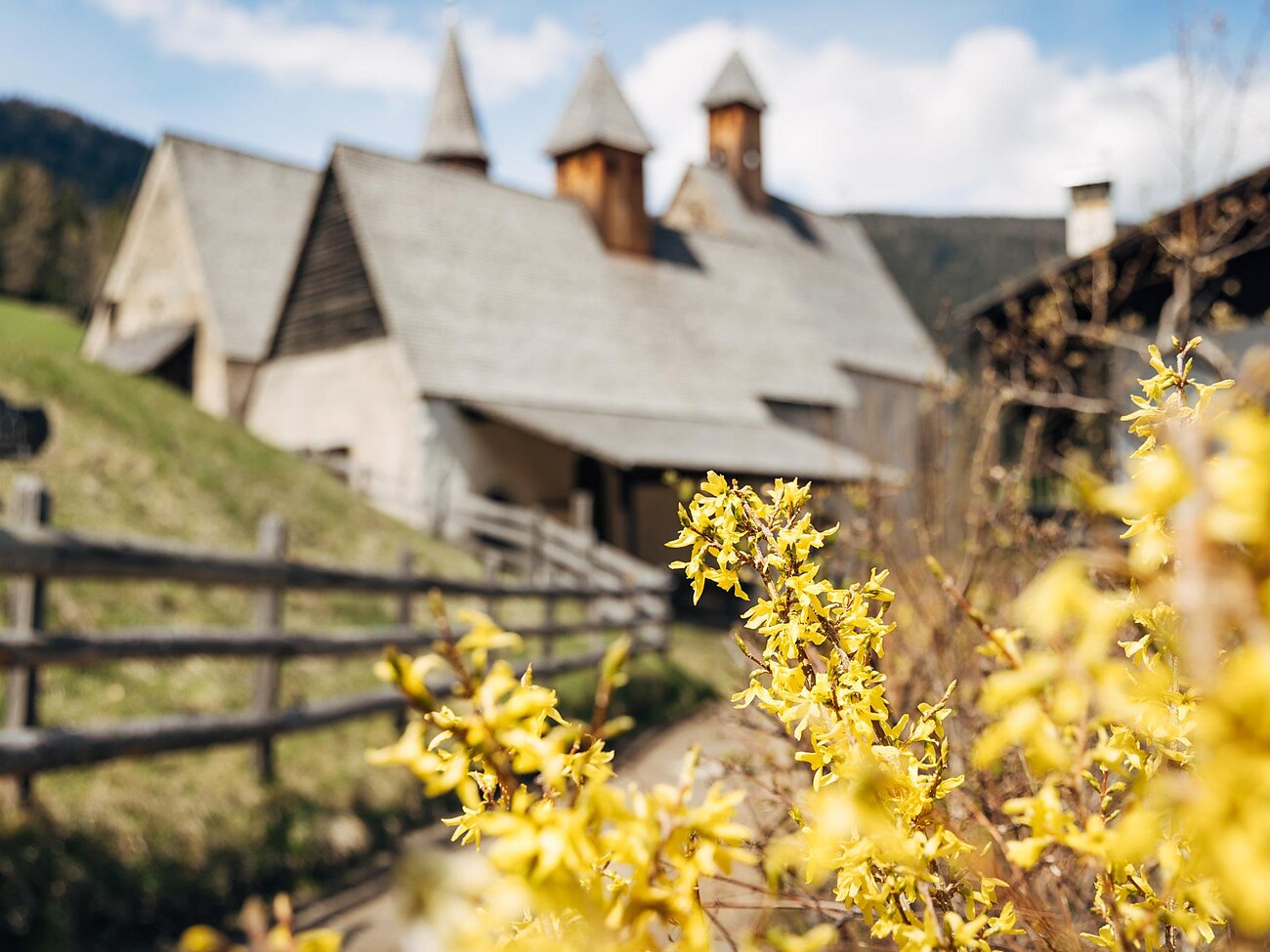 The spring hike on the sunny slope of Barbian leads past fields of flowers, streams, chestnut trees and historic buildings to "Dreikirchen".