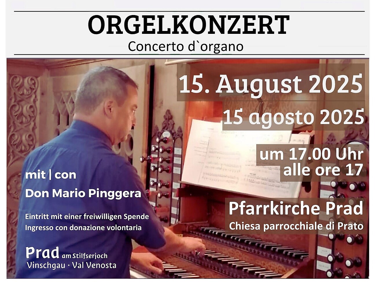 Orgelkonzert mit Don Mario Pinggera in der Pfarrkirche von Prad am Stilfserjoch am 15. August um 17.00 Uhr!