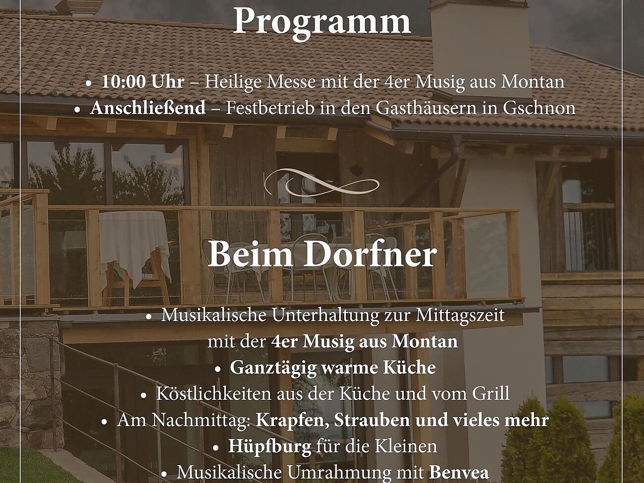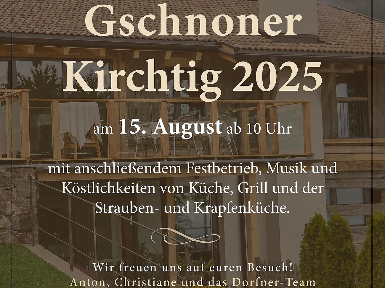 Gschnoner Kirchtag on August 15 starting at 10:00 a.m., followed by festivities with music and culinary delights from the kitchen, grill, and the traditional Strauben and Krapfen kitchen.