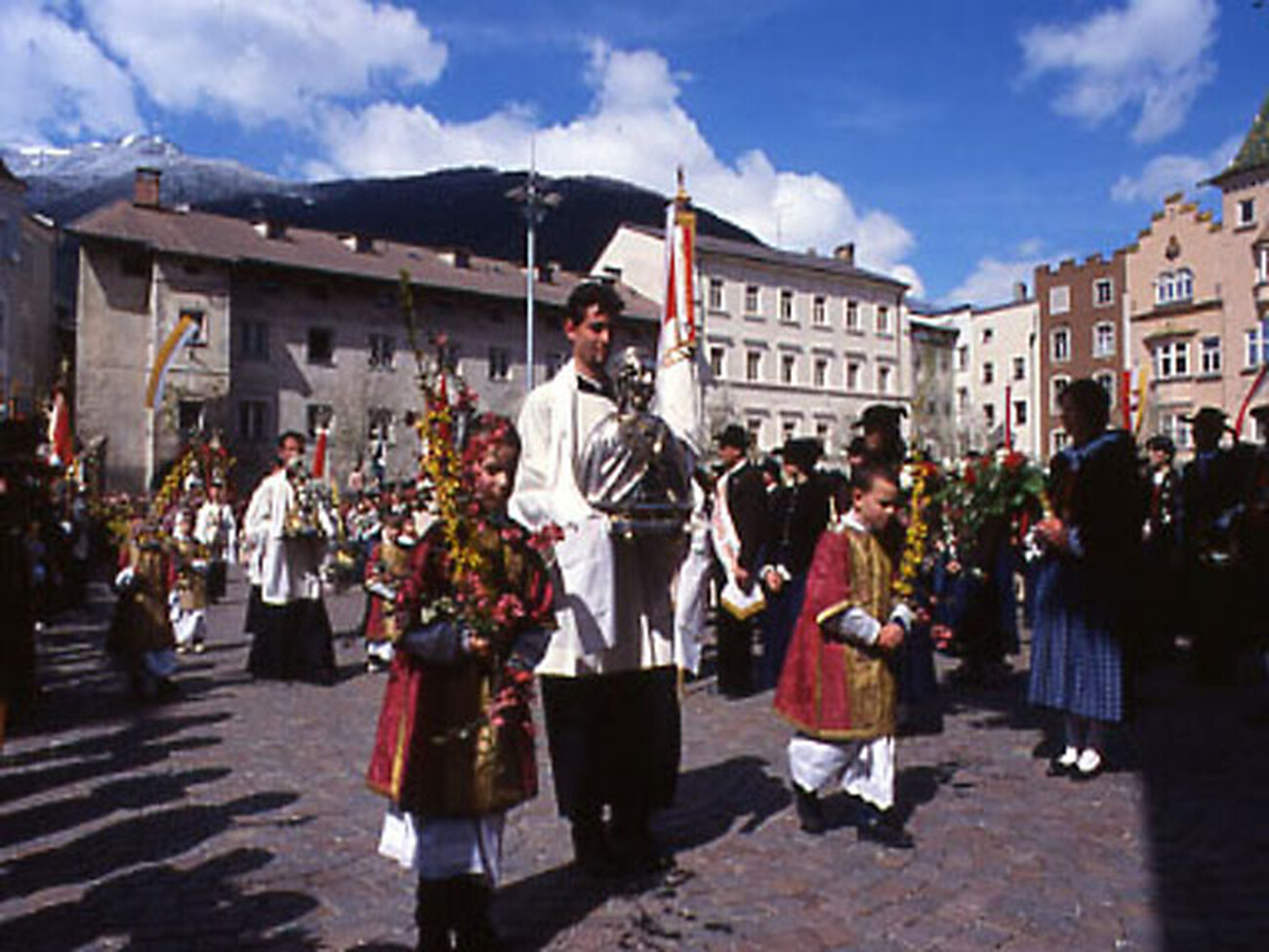 The solemn procession into Bressanone Cathedral begins at 9 a.m. for the festive mass with Bishop Ivo Muser. At around 10.15 a.m., the procession of St. Cassian begins with the holy relics through the streets of the town, accompanied by local bands and the Brixen citizens' band, the marksmen, clubs and associations. The procession is opened by the processional flag and the parish of Vahrn. This is because the people of Vahrn saved the relics of the diocesan saints from theft and desecration during the French period.