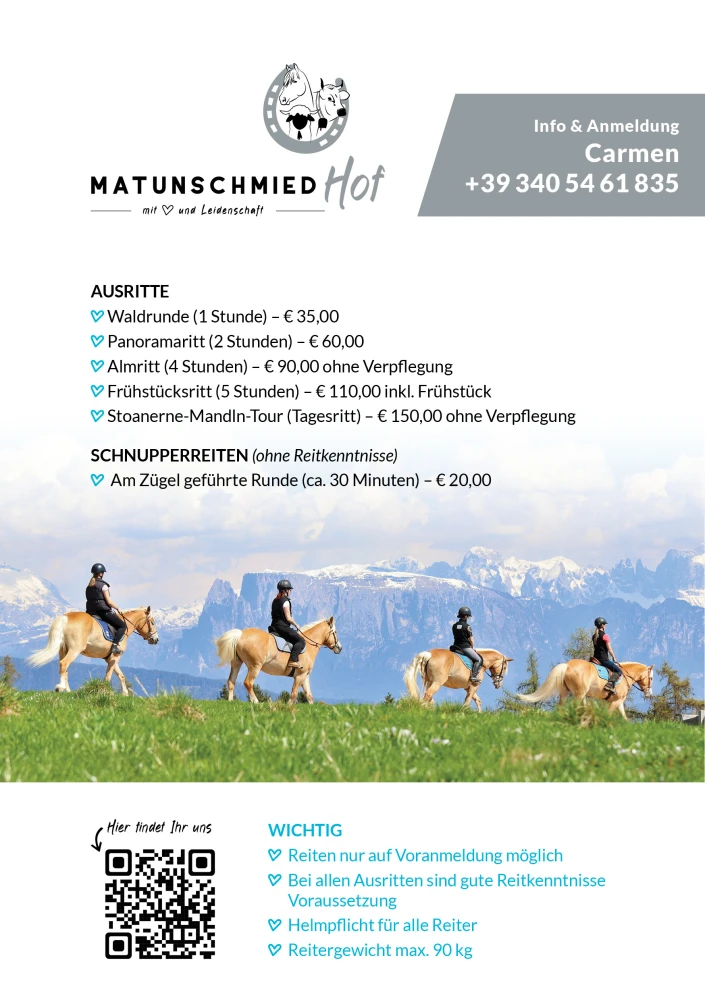 Whether it's a peaceful forest loop, a breathtaking panoramic ride, or a full-day tour to the Stoanerne Mandln – every horse lover will find the perfect adventure with us!