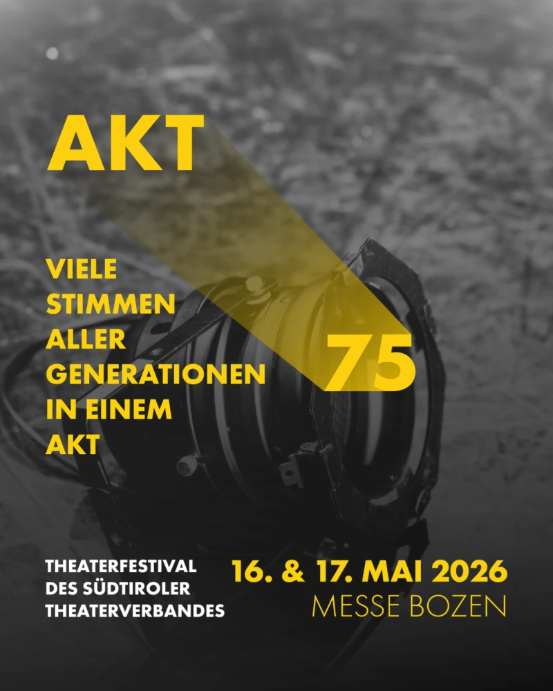 Am 16. und 17. Mai 2026 lädt der Südtiroler Theaterverband in die Messe Bozen zum großen Theaterfestival „Akt 75“ ein. Anlass ist das 75-jährige Bestehen des Verbandes, das mit einem bunten, generationsübergreifenden Fest der Theaterkunst gefeiert wird. Unter dem Motto „Viele Stimmen aller Generationen in einem Akt“ kommen Theatergruppen aus ganz Südtirol zusammen, um ihre Arbeit, ihre Kreativität und ihre Leidenschaft für das Theater zu präsentieren. Über 40 von insgesamt 216 Mitgliedsbühnen des STV zeigen am Festivalwochenende ihr Talent und präsentieren ein breites Spektrum an Theaterproduktionen – poetisch, lustig, spannend, skurril oder dramatisch.