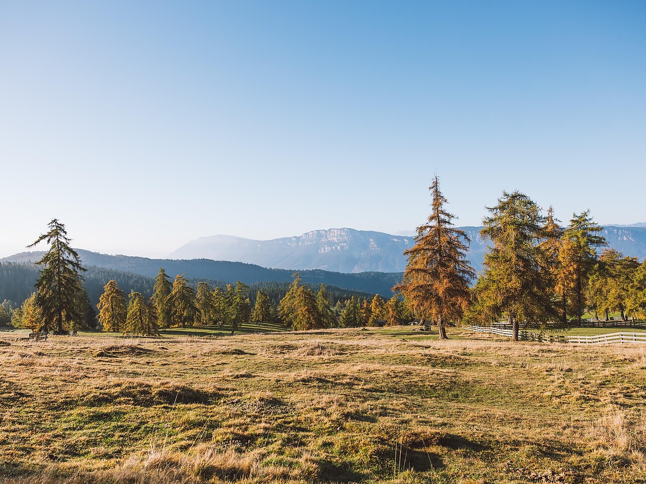 Vast meadows and the orange hues of the larch trees accompany us all day long. The larch meadows are the result of human intervention. The original forest cover was largely cleared to create meadows and pastures. Our destination is St. Jakob|San Giacomo on Langfenn with its simple yet charming St. Jakob’s Church. The name Langfenn comes from Old High German and means ‘long, wide meadow’. After lunch, there is a 10-minute descent to the Schermoos car park, where the hiking bus awaits us.