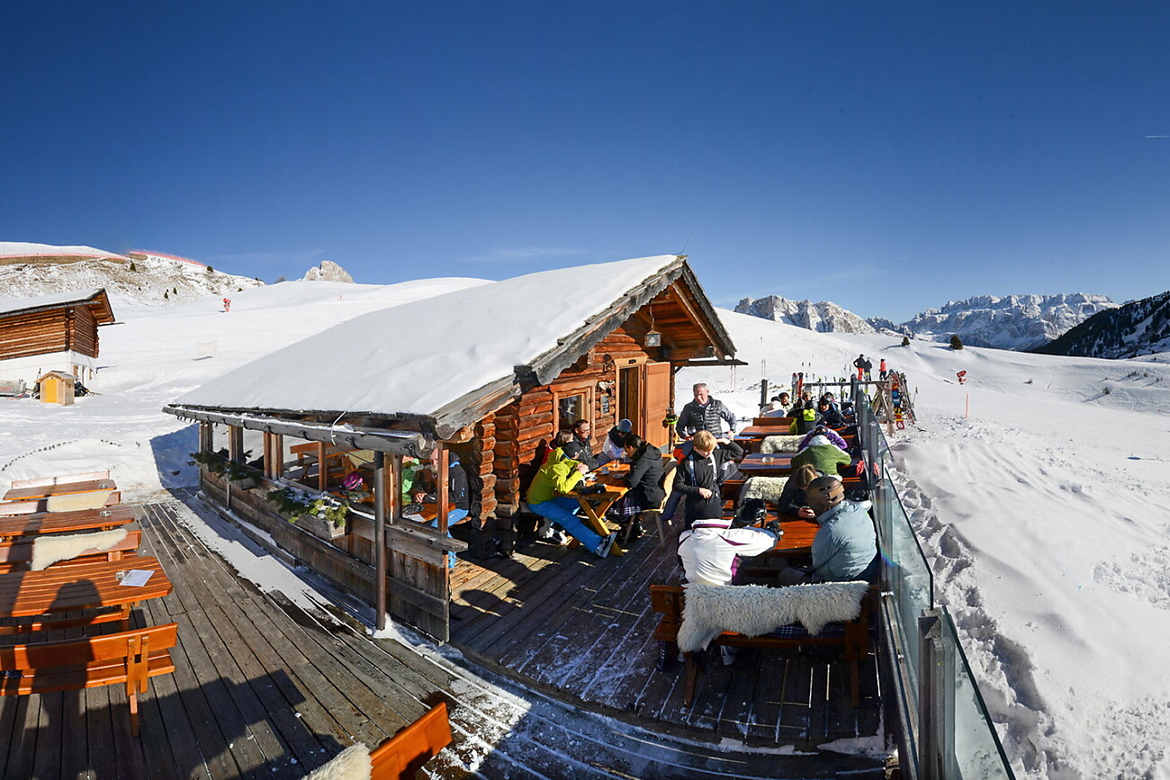 The quaint alpine Curona Hut invites you to relax in the sunshine and offers you an amazing view into the far reaches of the Dolomites. Enjoy a nourishing meal after an exciting or demanding excursion in our traditional alpine hut and let yourself be overcome by the smell of wood. We offer tasty dishes of local cuisine and snacks for in between and you can choose from a large selection of excellent wines. In winter the hut is ideally situated in the skiing area and directly on the downhill ski slope from Seceda to Ortisei, "La Longia".