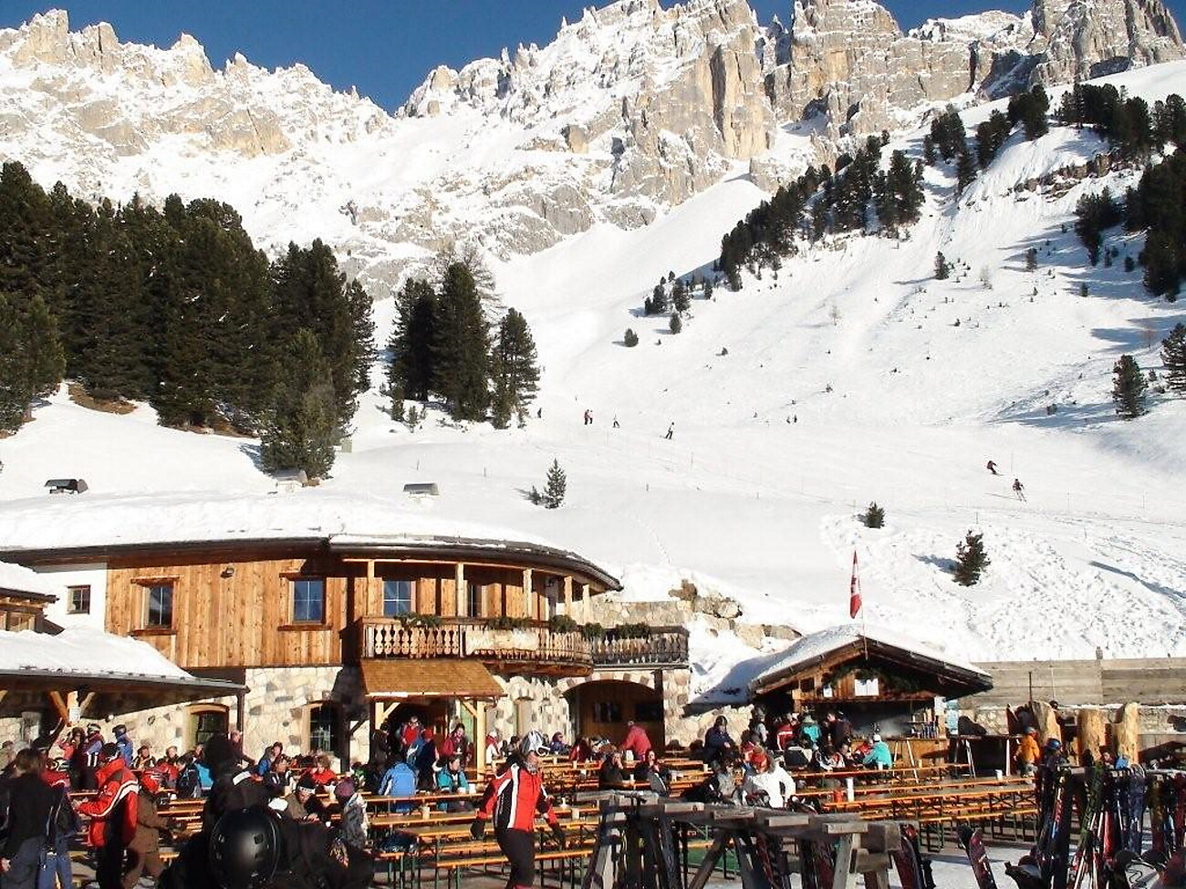 Our Mayrl Alm ski hut at 2037 metres above sea level at the heart of the Latemar Ski Centre is a well-known meeting place for anyone who loves good food. The sheltered sun terrace and the self-service or full service restaurant are all perfect for enjoying culinary treats (fish only during winter).
