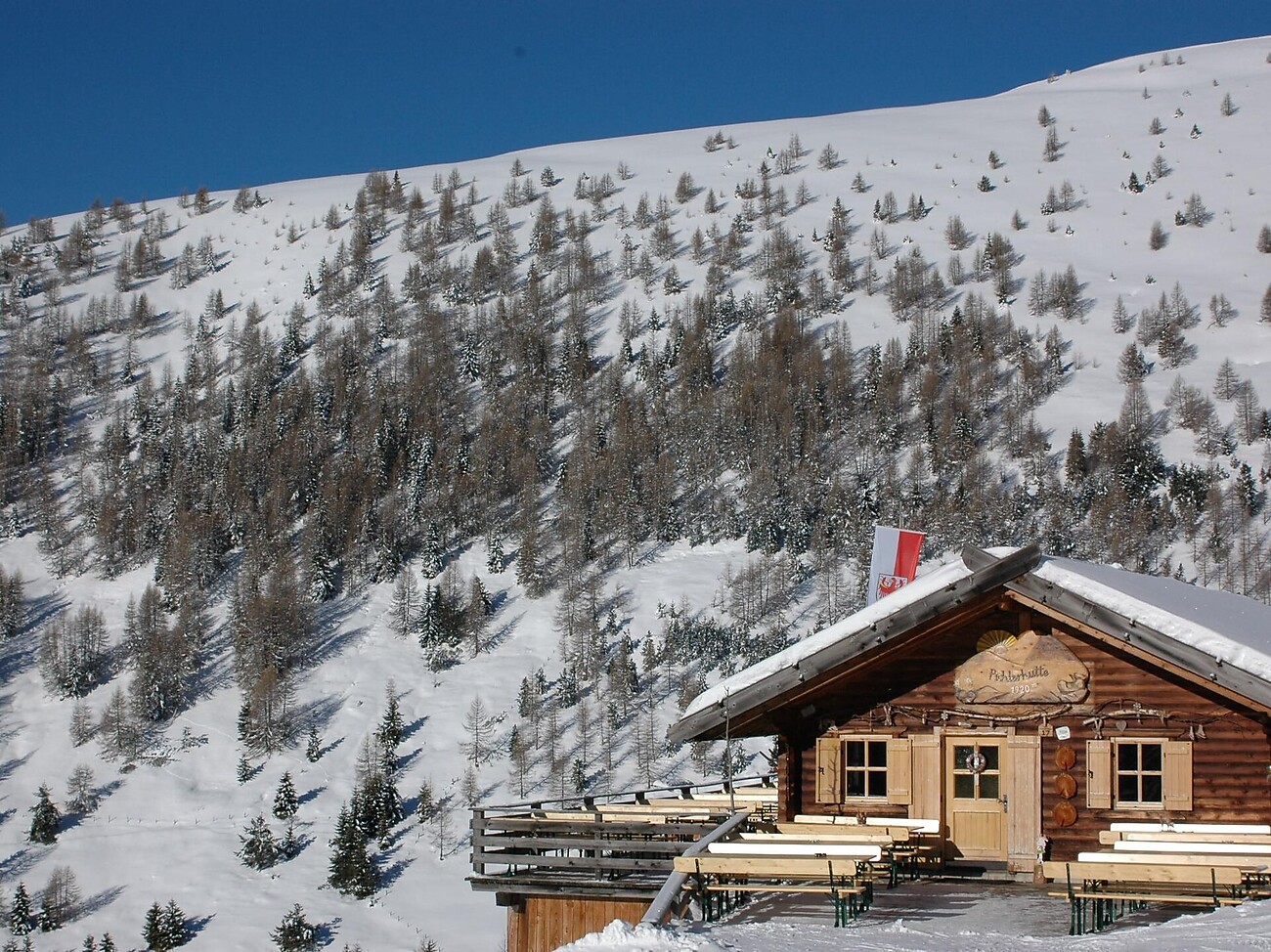 Our hut is directly on the ski slope with a big terrace, a beautiful panoramic view and continuously warm typical dishes.