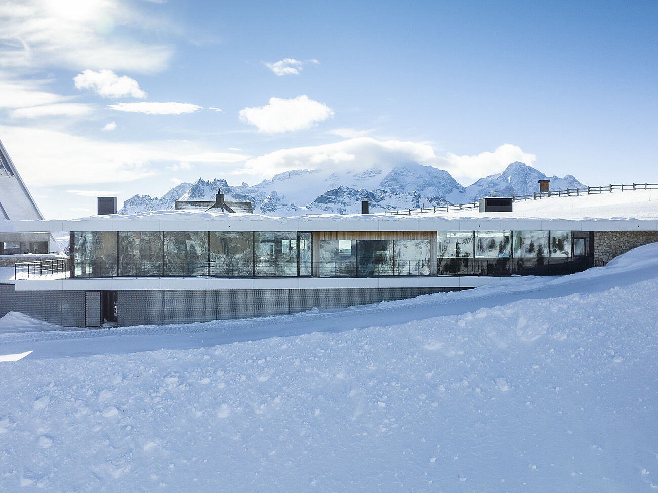 The PIZ BOÉ Alpine Lounge, at an altitude of 2,200 metres, adjacent to the mountain station of the Boé cable car, is conveniently accessible for everyone: skiers, hikers or even families with children.