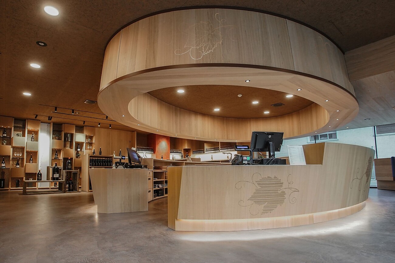 In the modern Vinothek in the main building of the winery, wine lovers, winegrowers and visitors alike should feel at home, enjoying a good glass of wine at the bar, but also being able to taste various wines. The focal point of the vinotheque is the elliptical bar counter. It symbolizes a large oak barrel and connects the cosy bar area with the tasting area.