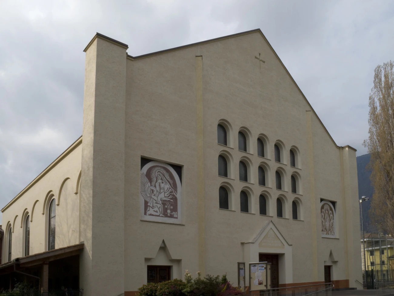 This modern church, which recalls the buildings of De Chirico, is located in Piazza Mazzini. Masses in Italian: weekdays (Monday to Saturday): 5:00 p.m. Wednesdays (bilingual mass): 5 p.m. Sunday: 10:30 a.m. & 6:00 p.m. Masses in German: Mondays, Tuesdays, Thursdays, Fridays: 6:00 p.m. Wednesdays (bilingual mass): 5 p.m. Days preceding holidays: 6:30 p.m. Sundays and public holidays: 9:00 a.m.