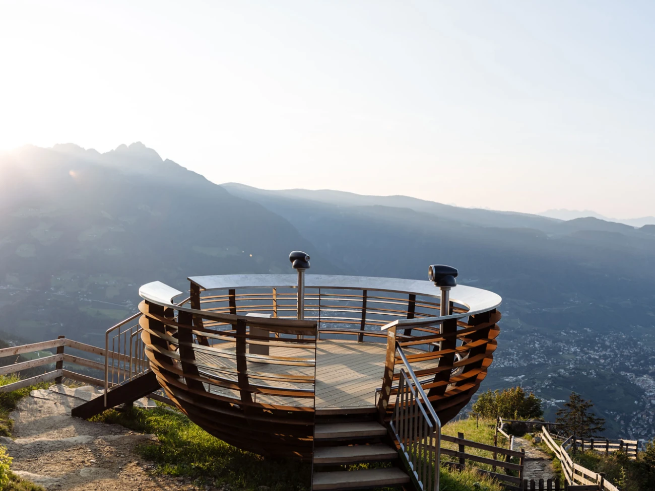 The viewing platform provides a breathtaking panoramic view of Merano and the Etsch Valley as well as the surrounding mountains. The platform is equipped with two telescopes and provides information on the mountains that can be seen from the Hochmuth, as well as on the cultivation of the steep fields of the Muthof farms in days gone by.