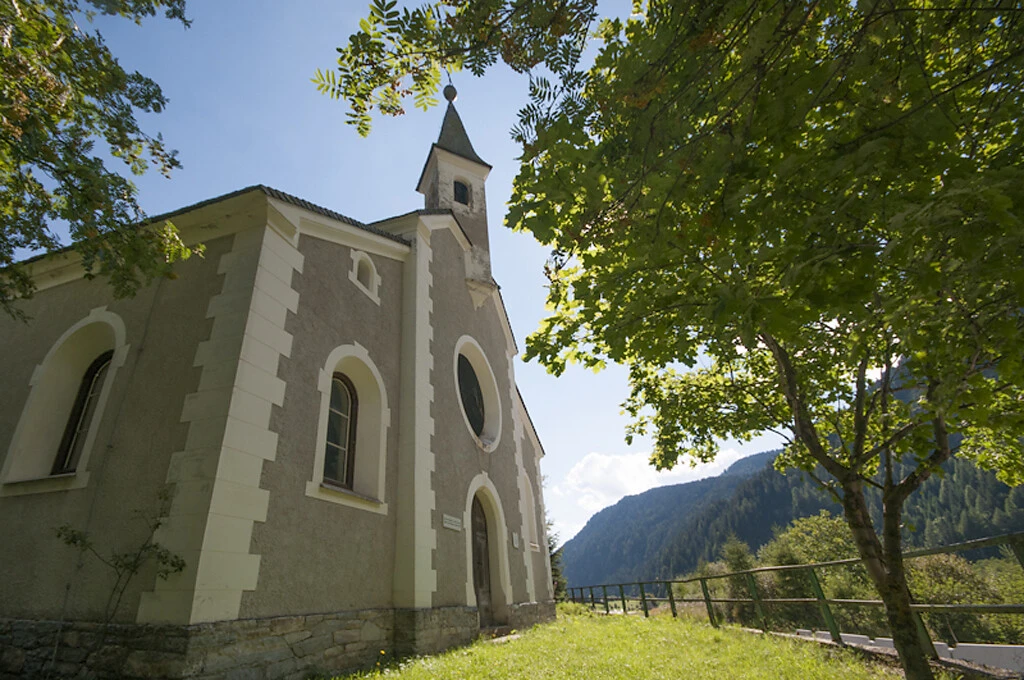 The Neoromanic building consists of a nave and two side aisles and a round apsis. The first high altar was made by F. Schmalzlaus from St. Ulrich/Ortisei, but it seems that already in the year 1889 the chapel received a new altar, made by the sculptor Stufflesser according to drafts by Johann Maria Reiter.
