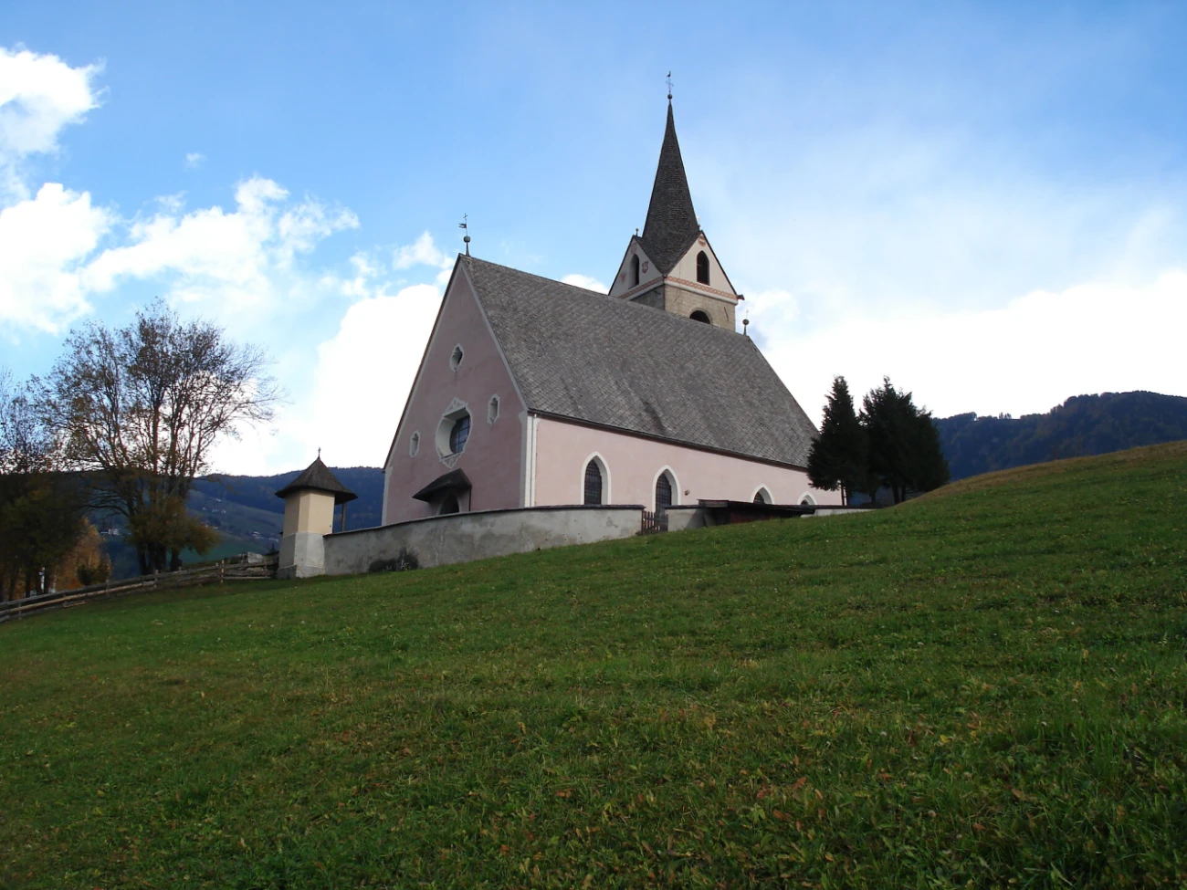 The last restorations date back to 1983. The interior is largely neo-Gothic from around 1870, although some of the wooden sculptures on the high altar date back to Adam Baldauf (1616 -1618). The gravestones of various Wolkensteins, the lords of Line (14th century) and the caretaker Caspar von Gufidaun, the great opponent of Cardinal Nikolaus Cusanus, who died in 1458, remind us of the history and connection with Rodenegg Castle. The well-kept cemetery with its lawn and exemplary wrought iron crosses contains around 200 graves and a simple cemetery chapel dating from 1697 with the image of St. Michael with the scales of the soul.