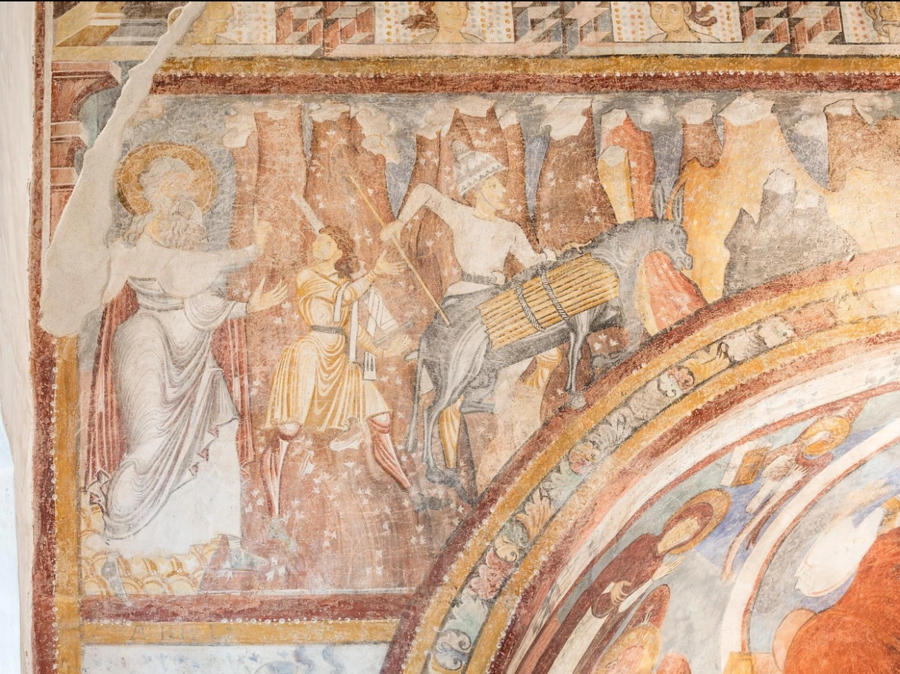 According to a 6 m-long inscription preserved in the presbytery, this simple, rectangular church with round apse in the east, was consecrated on 12 May 1142. It was painted around 1210 with outstanding and historically important Romanesque frescoes, which, among other things, show the planned sacrifice of Isaac by Abraham against a mountain backdrop. After the incorporation of the tower in around 1380, the church was decorated with Gothic paintings inside and also externally on the south wall. A wooden statue of St. James from 1520 which was revamped in 1610, and two Baroque altars on the west wall, can also be seen. Below the church there is a shrine with simple but expressive pictures from the period around 1440.