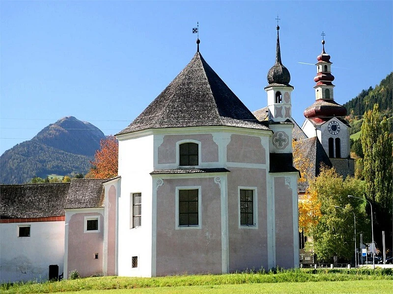The octagonal construction was built according to a project by Giuseppe Delai between 1729 and 1733, on the site of an older chapel. Matthäus Günther of Augsburg realised both the main altarpiece and the frescoes of the vaulted ceiling, which depict St. Elisabeth and St. George, the protectors of the Teutonic Order. The walls and vaulted ceiling are embellished with the rich and extraordinarily refined stucco decorations by Anton Gigl of Innsbruck. The church can be visited along the H. Multscher and City Museum.