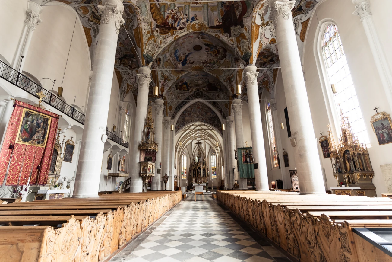 The parish church "Our Lady in the Moss," located in the south of Sterzing, is considered one of the largest in the Alpine region. It is a late Gothic structure (choir 1417-1451, nave 1497-1524). White marble was used for the massive pillars inside. Significant is the winged altar by the Ulm master Hans Multscher (details in the nearby Multscher Museum) and many other artworks. Particularly richly decorated is the south portal of the church designed by Mattheis Stöberl, with a commemorative inscription marking the laying of the foundation stone for the nave by Maximilian I in 1497. The Baroque frescoes date back to Adam Mölk and were completed in 1753.