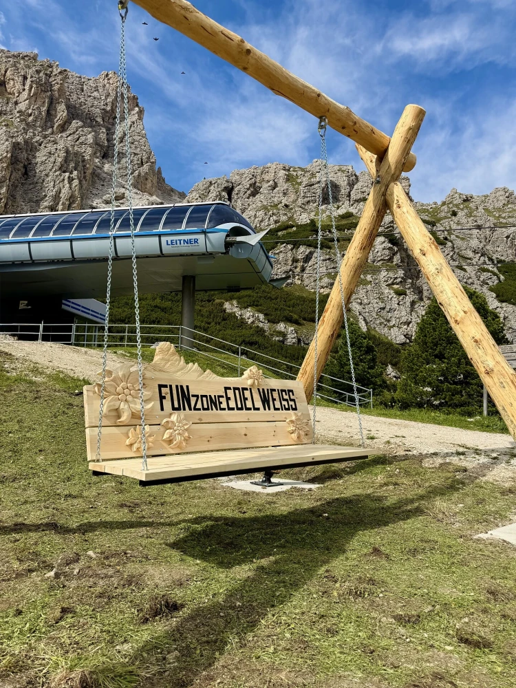 The new highlight of this summer is “La Sbinga,” a Ladin word meaning swing: a special spot to sit and enjoy the simple pleasure of swinging while admiring the majestic Sella group. Located above the Plans-Frara lift station, La Sbinga will take you back to childhood, leaving you enchanted by the magic of the landscape.