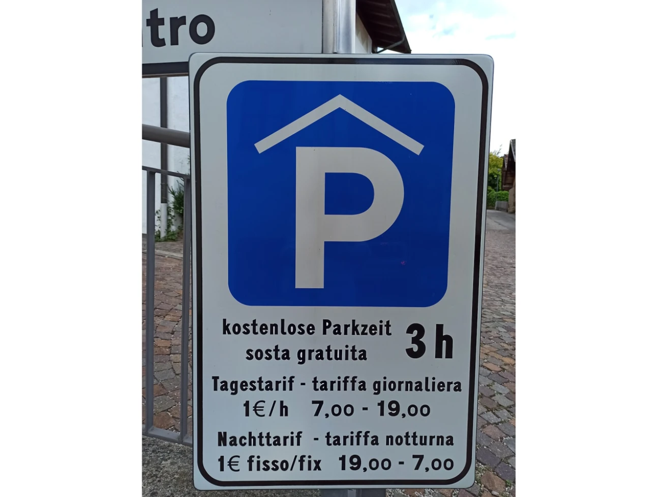 Public underground parking area (car park no. 1) in the center of Tisens at the municipal building and right next to the bank building ("Raiffeisenkasse"). Between 7 a.m. and 7 p.m. it is possible to park for 3 hours free of charge and after that for every additional hour has to be paid € 1,00. For parking at night, between 7 p.m. and 7 a.m., must be paid € 1.00 (night fee).