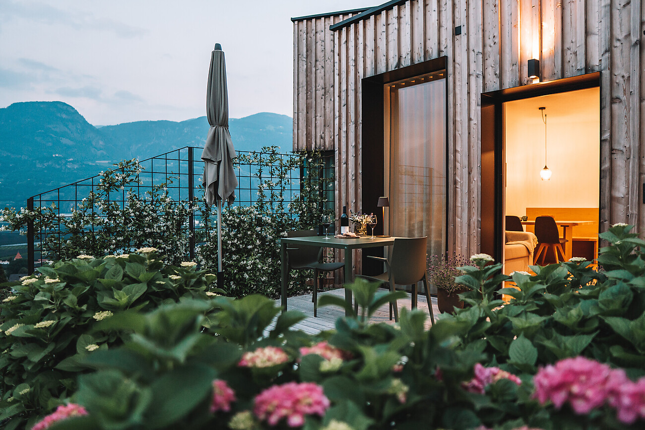 Design moderno, interni ed esterni in legno e tonalità naturali: il maso e l’appartamento vacanze si mescolano ai colori del paesaggio alpino circostante, creando un insieme armonico. A fargli da cornice sono il verde della campagna meranese, le imponenti montagne, i graziosi paesini e le sconfinate valli.