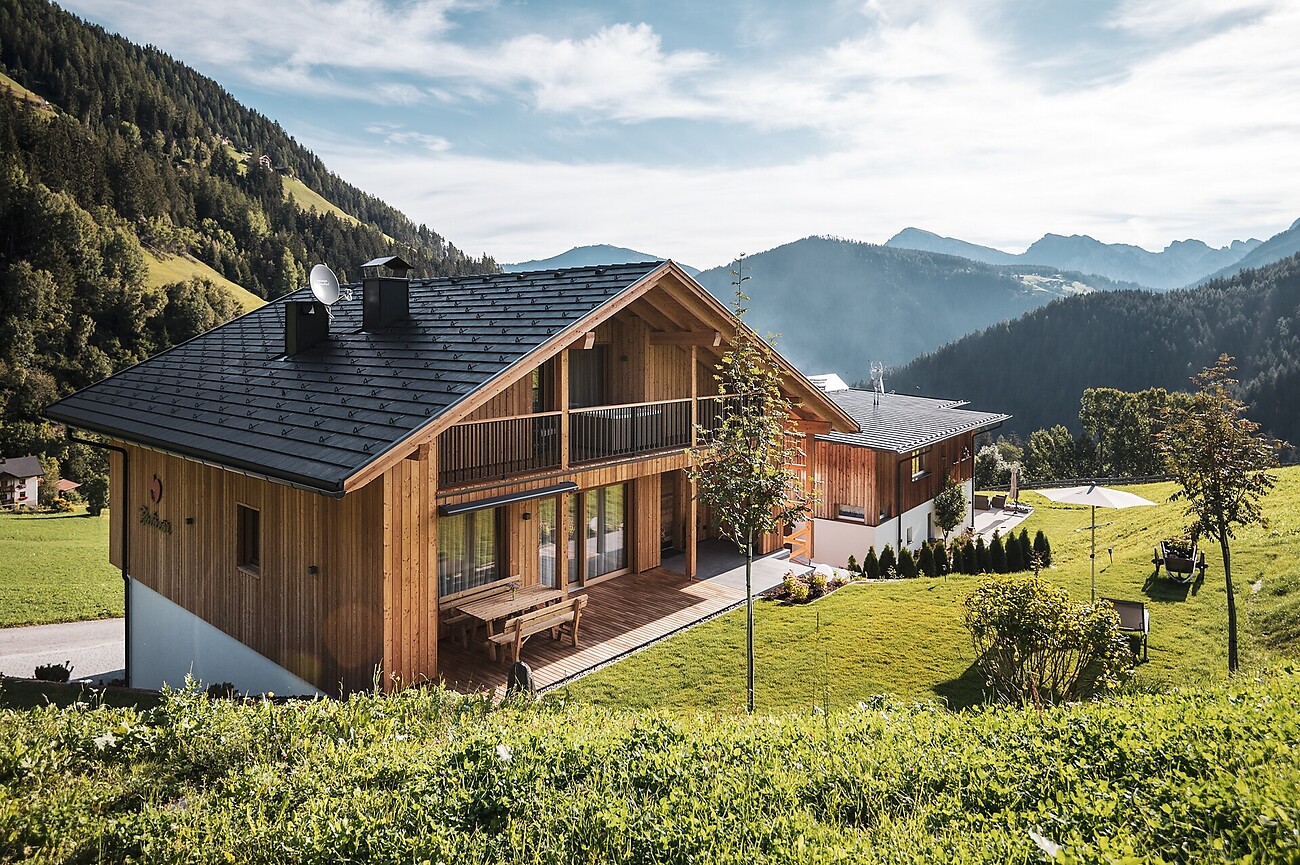 La casa si estende su una superficie di 120 mq ed è dotata al piano terra di due camere doppie tematiche con bagno e uno spazioso balcone, di una cucina e di un ampio soggiorno con caminetto a legna. Al primo piano si trova la zona wellness con sauna, whirlpool, cure Kneipp, doccia tonificante e revitalizzante, angolo riposo con bar del thè ed area esterna. L'intero chalet è rifinito con legnami locali di cirmolo, larice ed abete. Un ampio giardino con giochi per bambini e un piccolo orto da cui potete naturalmente servirvi circonda la casa.