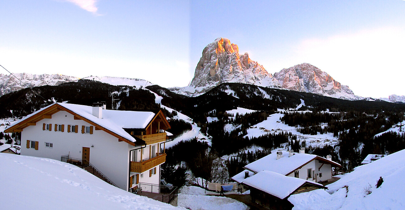 Bella, posizione tranquilla con vista direttamente sul Guppo del Sasso lungo, Gruppo del Sella, Cir e su Selva che é stupendamente ben illuminata d'inverno. La nostra casa è ideale per coppie, famiglie con bambini, gruppi grandi e amanti della natura. Ha 250 mq di giardino con trampolino. É un buon punto di partenza per escursioni sia lunghe che corte.