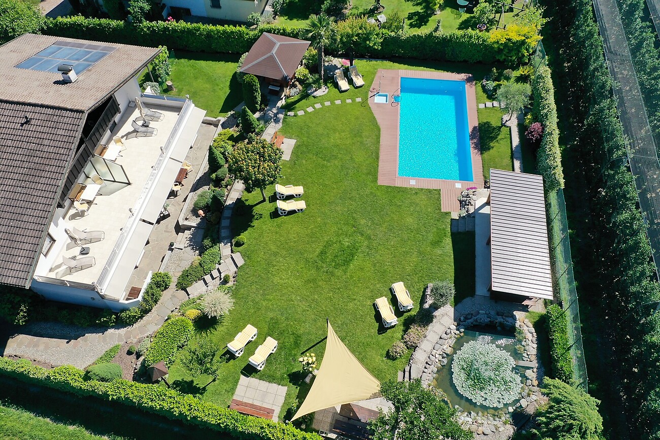 Vacanze da noi significa riposo, relax, distrarsi dalla vita quotidiana e riacquistare nuove forze. Il nostro ampio e curato giardino invita a trattenersi un po´ di più : leggere un buon libro sullo sdraio, rinfrescarsi nella piscina ben curata, osservare i pesciolini nello stagno, rilassarsi nell`idromassaggio o facendo una partita a ping pong. Merano e dintorni è famosa per le sue varietà. Qua si incontrano un `atmosfera mediterranea e un magnifico paesaggio montano, piatti italiani e tipica cucina tirolese. Una cosa in comune hanno l`estate calda, l`inverno bianco, la primavera miete e l`autunno in colore : 300 giorni di sole all`anno. L`Alto Adige è un paradiso per le vacanze. Innumerevoli possibilità per escursioni vi aspettano : gite culturali, comode passeggiate o impegnative camminate in montagna, e se dovesse per caso piovere, sempre a vostra disposizione una vasta varietà di musei, castelli medievali, stabilimenti termali, comode gallerie commerciali ed invitanti cafè.