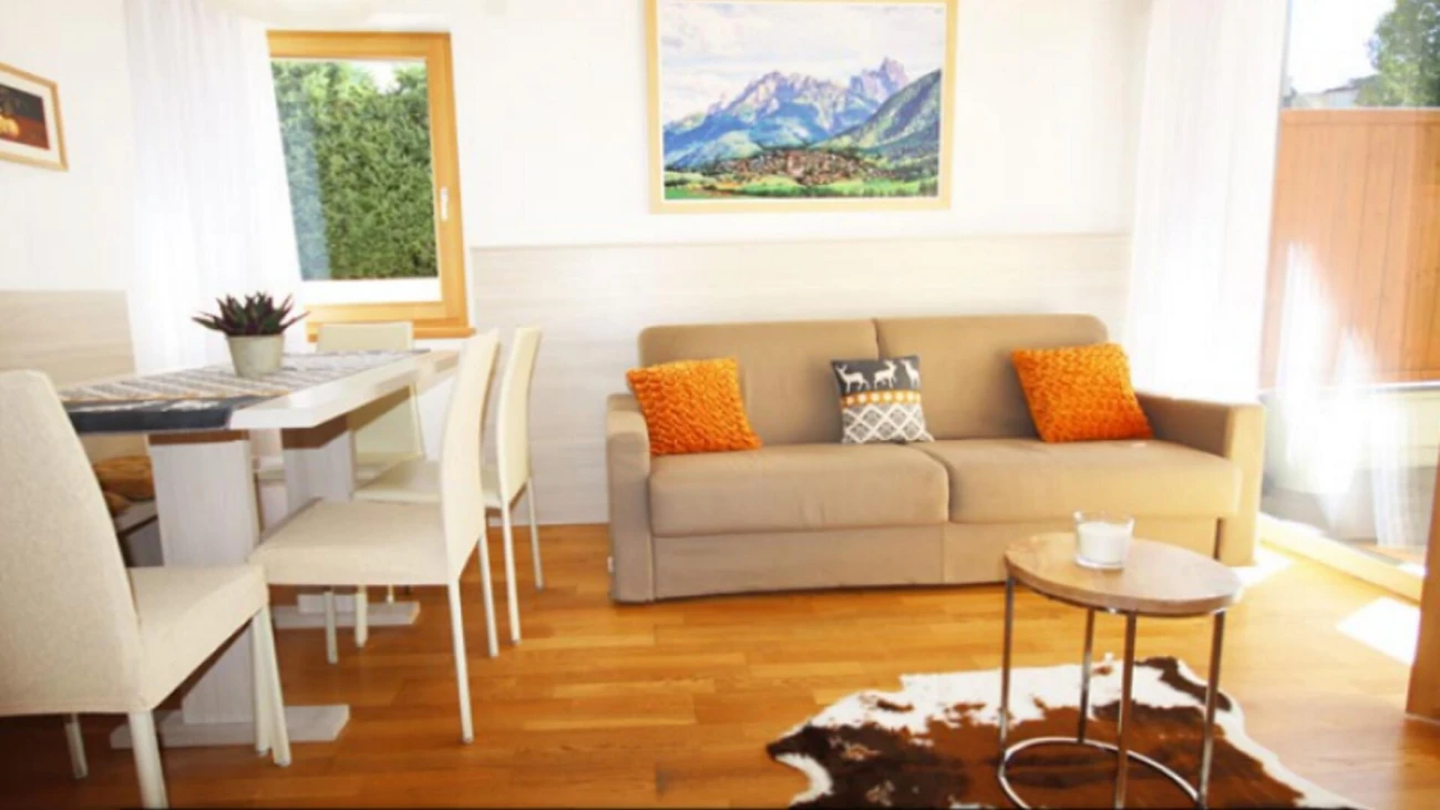 L´appartamento situato al piano terra puó ospitare fino a 6 persone. Dispone di una zona giorno living molto luminosa con divano letto e angolo cottura completamente accessoriato, una camera da letto matrimoniale, una camera con letto a castello e un bagno con doccia finestrato. Sono presenti inoltre un giardino soleggiato accessibile dal soggiorno e un ulteriore spazio verde accessibile dalle camere. E´ammesso il soggiorno con animali domestici. Completando l´offerta un posto auto in garage e il WI FI gratuito.