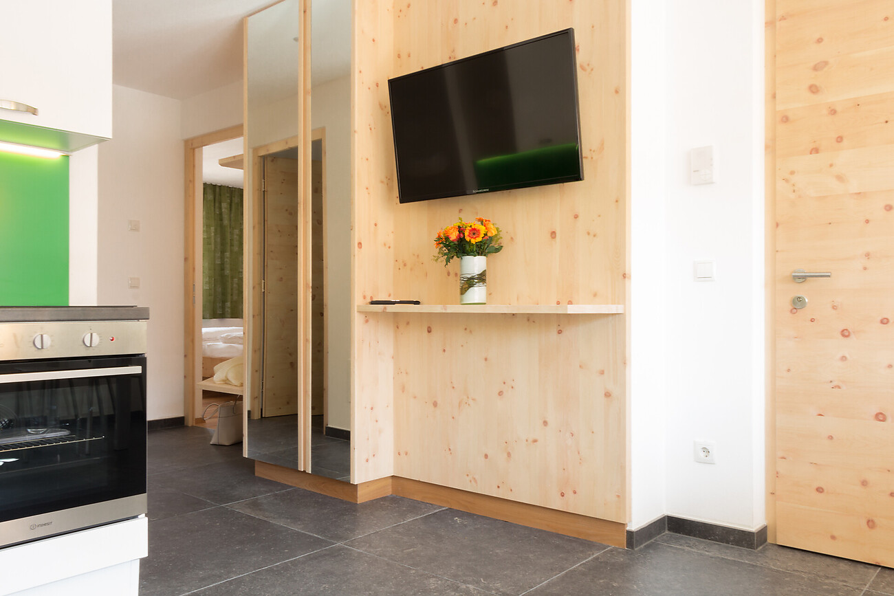 In ogni appartamento troverete ogni comfort come a casa Vostra. Aprendo la porta il profumo di legno di cirmolo Vi rilasserà immediatamente. Nella nostra silenziosa terrazza potete fare bagni di sole o pranzare all’aperto.