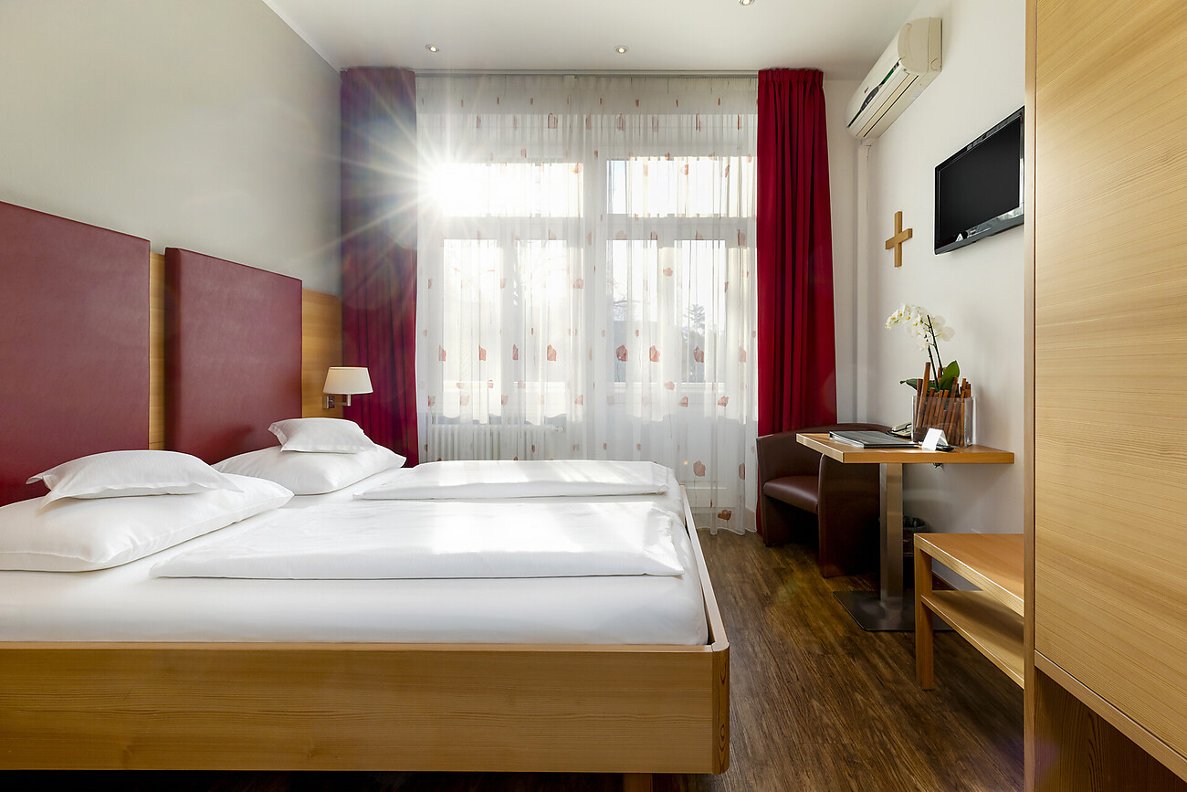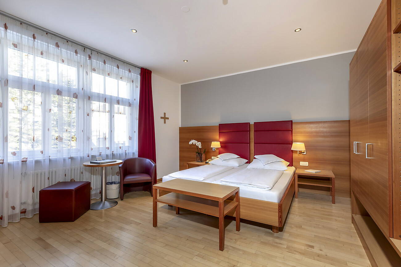 Le camere sono tutte dotate di bagno/doccia, WC, asciugacapelli, W-LAN, telefono e TV satellitare. In parte sono dotate di un balcone e di un impianto di condizionamento. Inoltre ci sono a disposizione aule di congresso, bar & bistro, piscina all'aperto, cappella e nuova area SPA con sauna finlandese, sauna a vapore, idromassaggio, fontana di ghiaccio e sale relax, oltre a una terrazza sul tetto con vista.