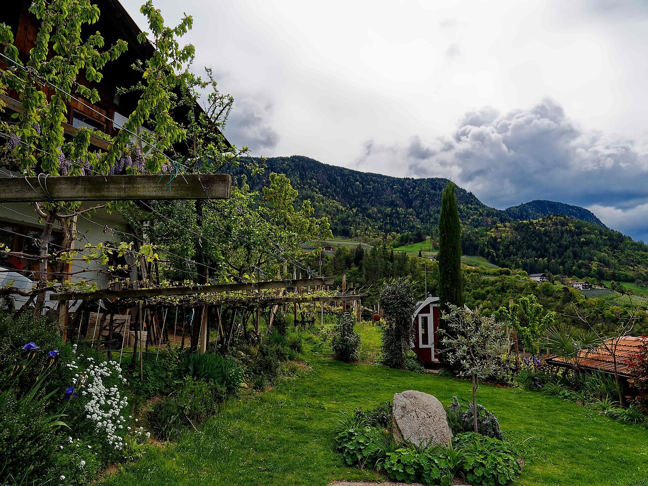 Il nostro maso si trova all'ingresso di Scena, in mezzo a vigneti e frutteti, in una posizione tranquilla con una splendida vista sulla conca di Merano e sulle affascinanti montagne dell'Alto Adige. Rilassatevi sul nostro prato a bordo piscina, godetevi la tranquillità e la nostra ospitalità.