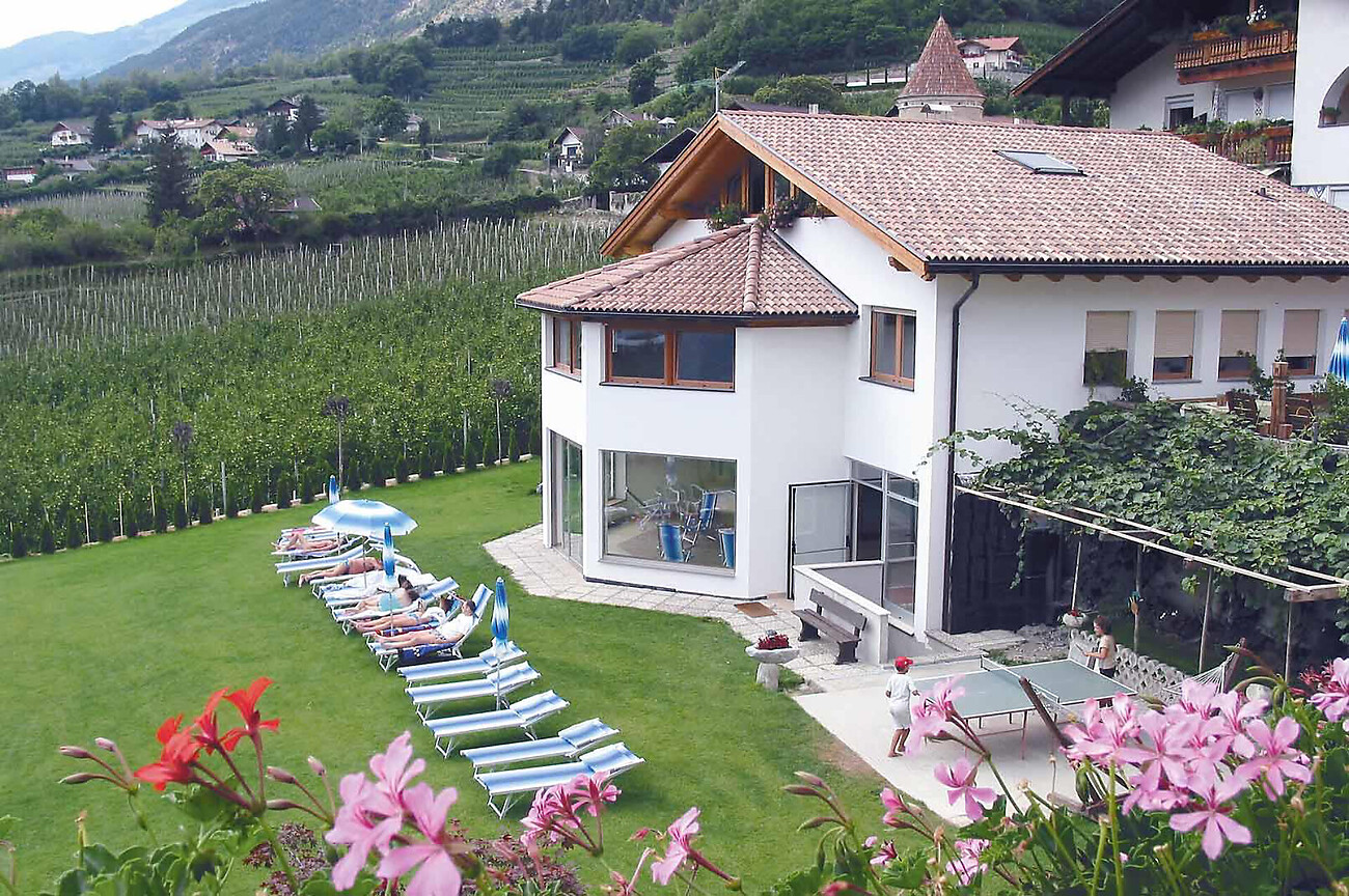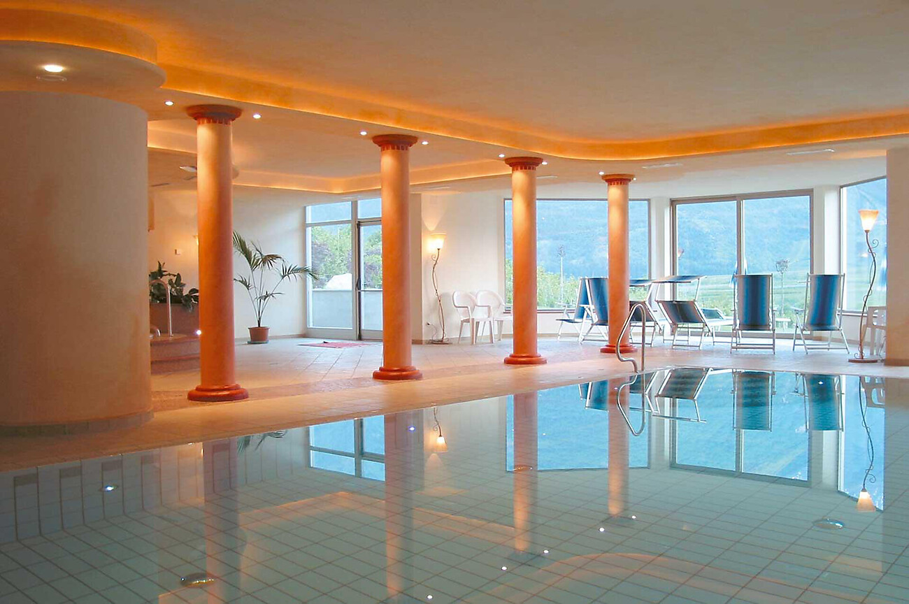 Pensione e residence per famiglie, in tranquilla posizione soleggiata con piscina coperta e zona wellness. Ampio giardino con sedie a sdraio.