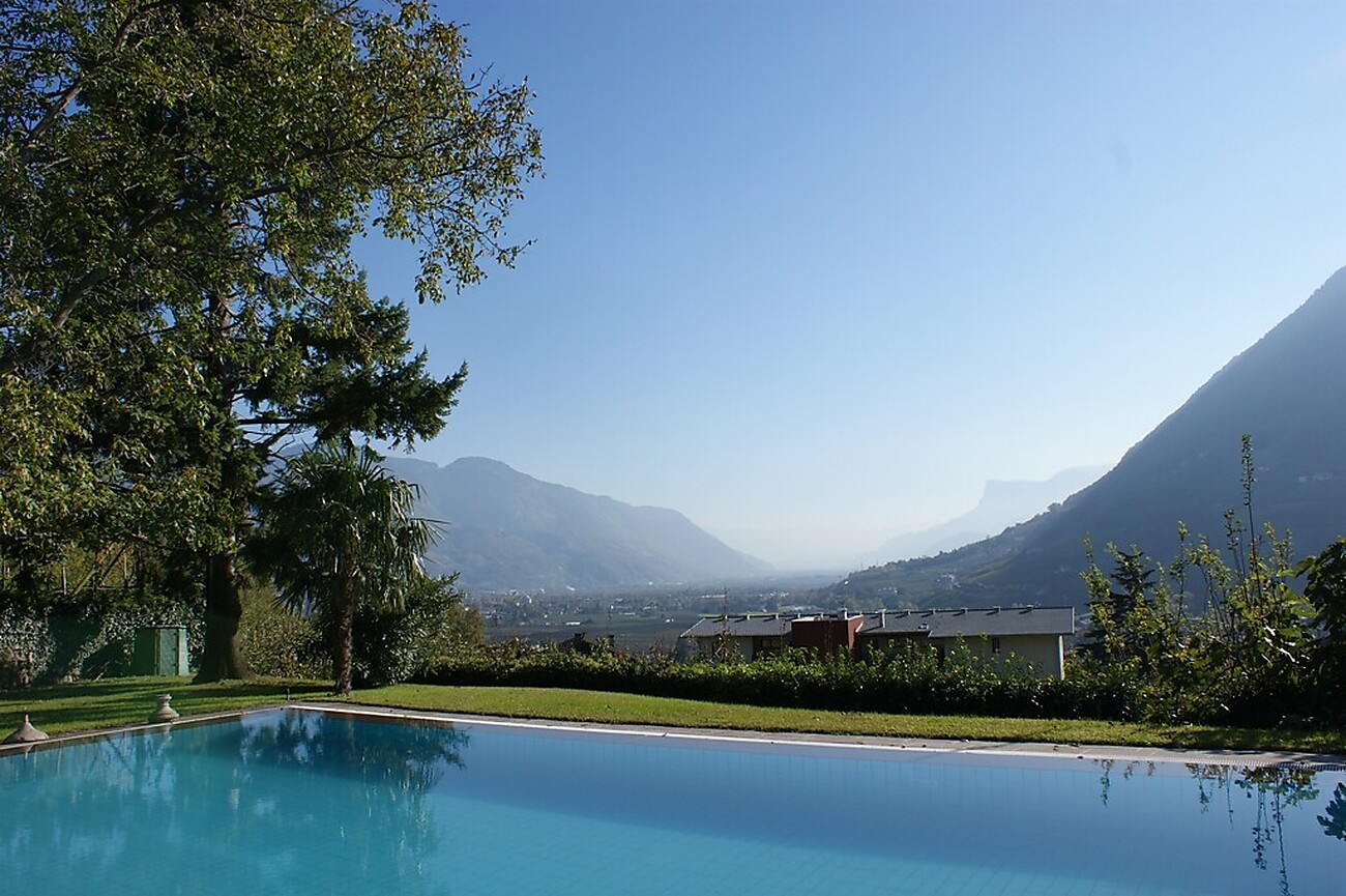 Situato in mezzo di frutteti, con una stupenda vista sú Merano e la Val d´ Adige. Pace assoluta senza traffico garantita. Ideale punto di partenza per gite e escursioni. Amichevolezza e ospitalitá e un nostro obbligo. Appartamenti da 2-6 persone con doccia/WC, spazio cucina, cassaforte, tavola da ping-pong, Sauna, solario, un grande prato per sdraiarsi con vista panoramica e una piscina all´ aperto, e una coperta. Un parcheggio offre sufficiente spazio di sosta per le sue macchine.