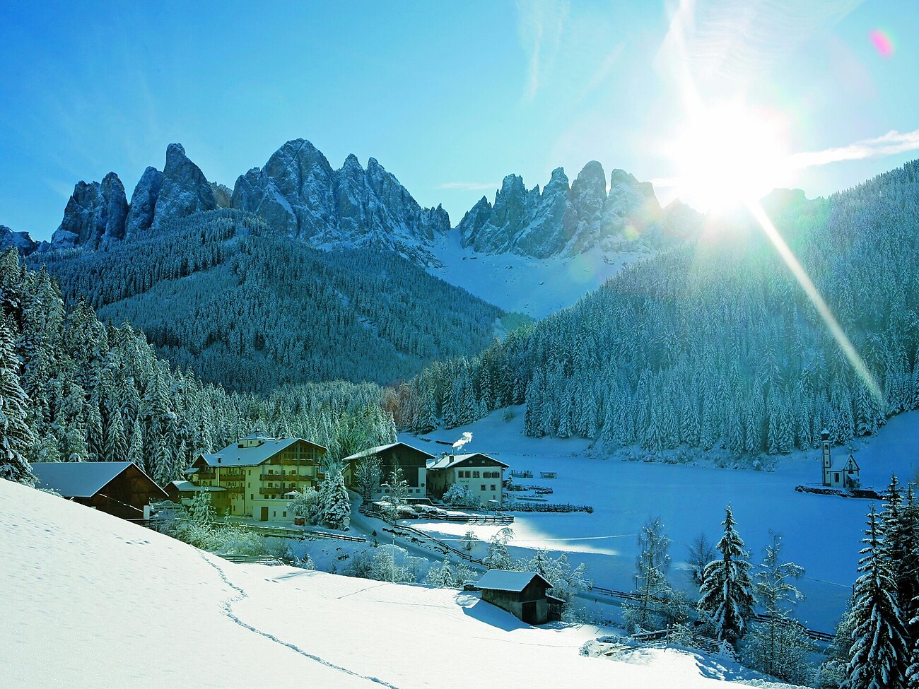 Conquistare la natura, camminare attraverso il paesaggio, vivere la cultura e scoprire la tradizione in un'antica residenza di caccia. All'interno della casa, circondati da affreschi e da un ambiente raffinato, potrete fare un tuffo nel tempo passato. Nella Stube accogliente vi aspetta un ricca colazione con prodotti fatti in casa vitale che fa battere forte il cuore di ogni buongustaio. Nelle nuove camere e nei bagni, arredati con molta cura, vivrete i fasti di una storia antica. La chiesetta di San Giovanni a Ranui, molto vicina e molto conosciuta, fa parte del maso e invita a passare delle ore romantiche con una splendida vista sulle cime delle Odle. Il maso Ranui si trova alla fine della valle ed è il punto di partenza ideale per camminate meravigliose alle numerose malghe della Val di Funes, nel Parco Naturale Puez Odle. La terrazza e il prato soleggiato invitano a soffermarsi. Il nostro sentiero Kneipp vi aspiererà. Parcheggio privato. Aspettiamo la Vostra richiesta.