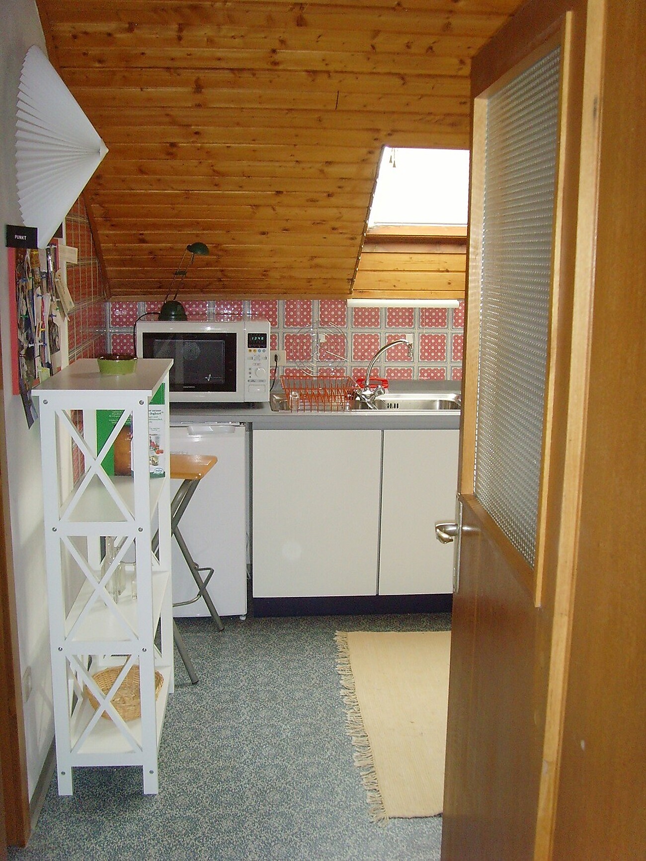 Nell'accogliente zona pranzo-soggiorno (circa 40 m²), un salotto (divano letto + 2 poltrone) invitano a rilassarsi. La cucina adiacente alla zona pranzo-soggiorno (circa 10 m²) è dotata di fornelli, frigorifero, forno a microonde (con grill e forno a convezione) e di tutto ciò che serve in una cucina ben attrezzata.