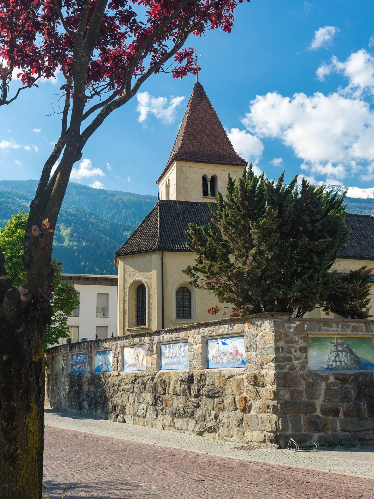 La chiesa si presenta con il suo massiccio campanile romano e due dipinti barocchi dell'artista valdostano Simon Ybertracher (1694-1792); sulle mura di cinta del cimitero della chiesa è dipinta una moderna Danza Macabra: 18 allegorie sulla vita e la morte rappresentate con crudo realismo dal pittore venostano Luis Stefan Stecher (2001).