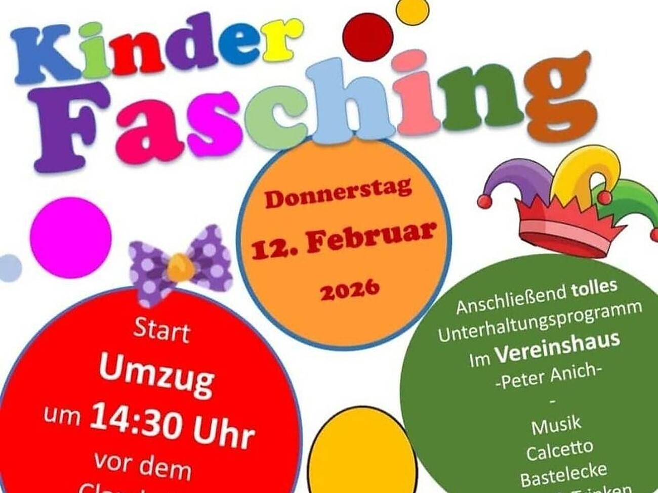 Il giovedì grasso, Collepietra si trasforma in un paradiso del carnevale per i piccoli buffoni! Si inizia alle 14:30 con un allegro corteo che parte dalla piazza della chiesa di Collepietra. Dopo nella Casa Culturale di Collepietra vi aspetta un variopinto programma di intrattenimento: Musica, giochi divertenti, un angolo di attività creative, Calcetto e, naturalmente, tanti piatti e bevande deliziosi!