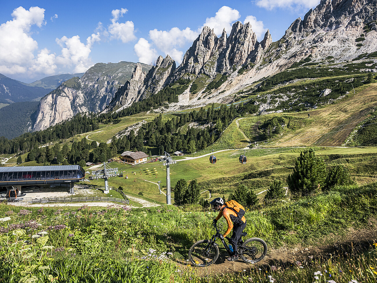 Divertimento puro su 13,9 km: la "Trail Arena Val Gardena" offre un totale di 6 percorsi - 3 flow trails facili, 2 flow trails di media difficoltà e un tracciato freeride. Tutti i percorsi sono collegati tra di loro tramite impianti di risalita e diversi sentieri. Naturalmente la gita guidata prevede anche consigli di un esperto: un breve corso di tecnica fornisce conoscenze di base per un buon feeling di guida e un utilizzo sicuro dei trails. Questo è esattamente ciò che fa battere forte il cuore di un vero biker.