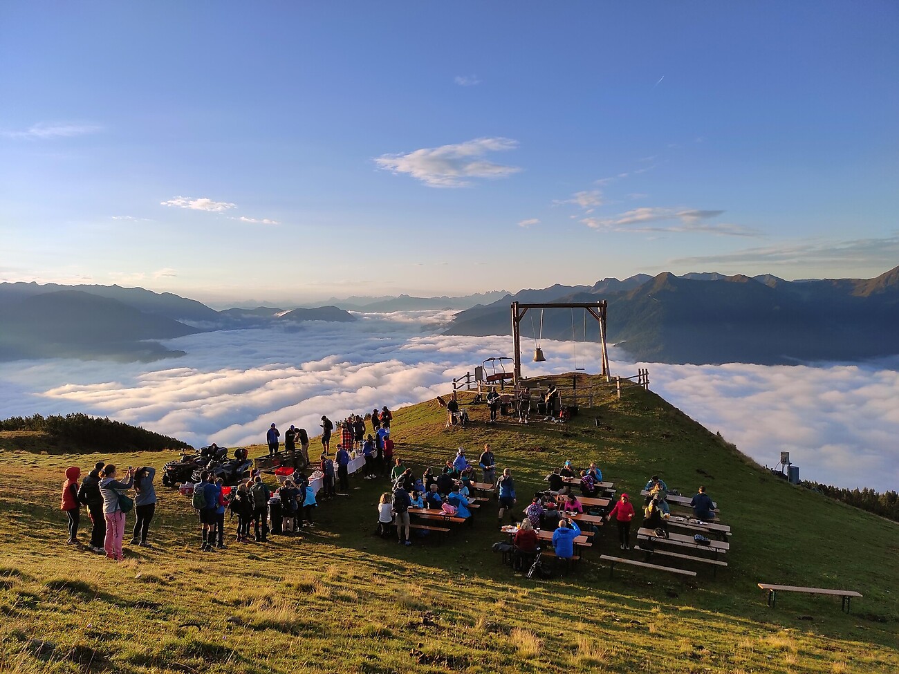 In estate, i visitatori del Monte Cavallo potranno assistere a un evento straordinario: i concerti all'alba con colazione in montagna presso la campana dei desideri. Nell'atmosfera speciale del primo mattino, gli ospiti potranno godere di una vista panoramica mozzafiato sulle Alpi dello Stubai.