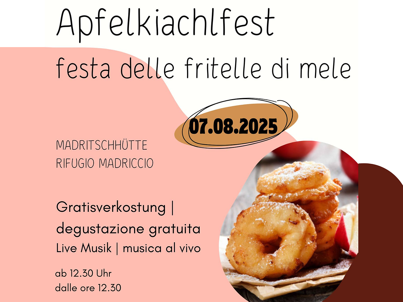 Degustazione gratuita di frittelle di mele fatte in casa con mele altoatesine e musica live presso il rifugio Madriccio a partire dalle 12.30.