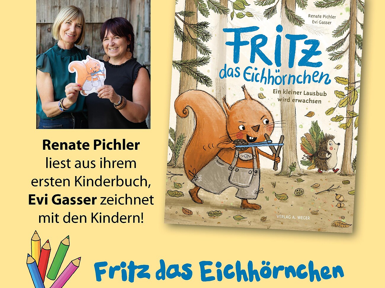 Vieni all'ora della lettura: "Fritz lo scoiattolo — Un piccolo monello diventa grande". Renate Pichler legge dal suo primo libro per bambini, Evi Gasser disegna insieme ai bambini. Per bambini da 4 anni in su. Presso la biblioteca di Castelrotto.