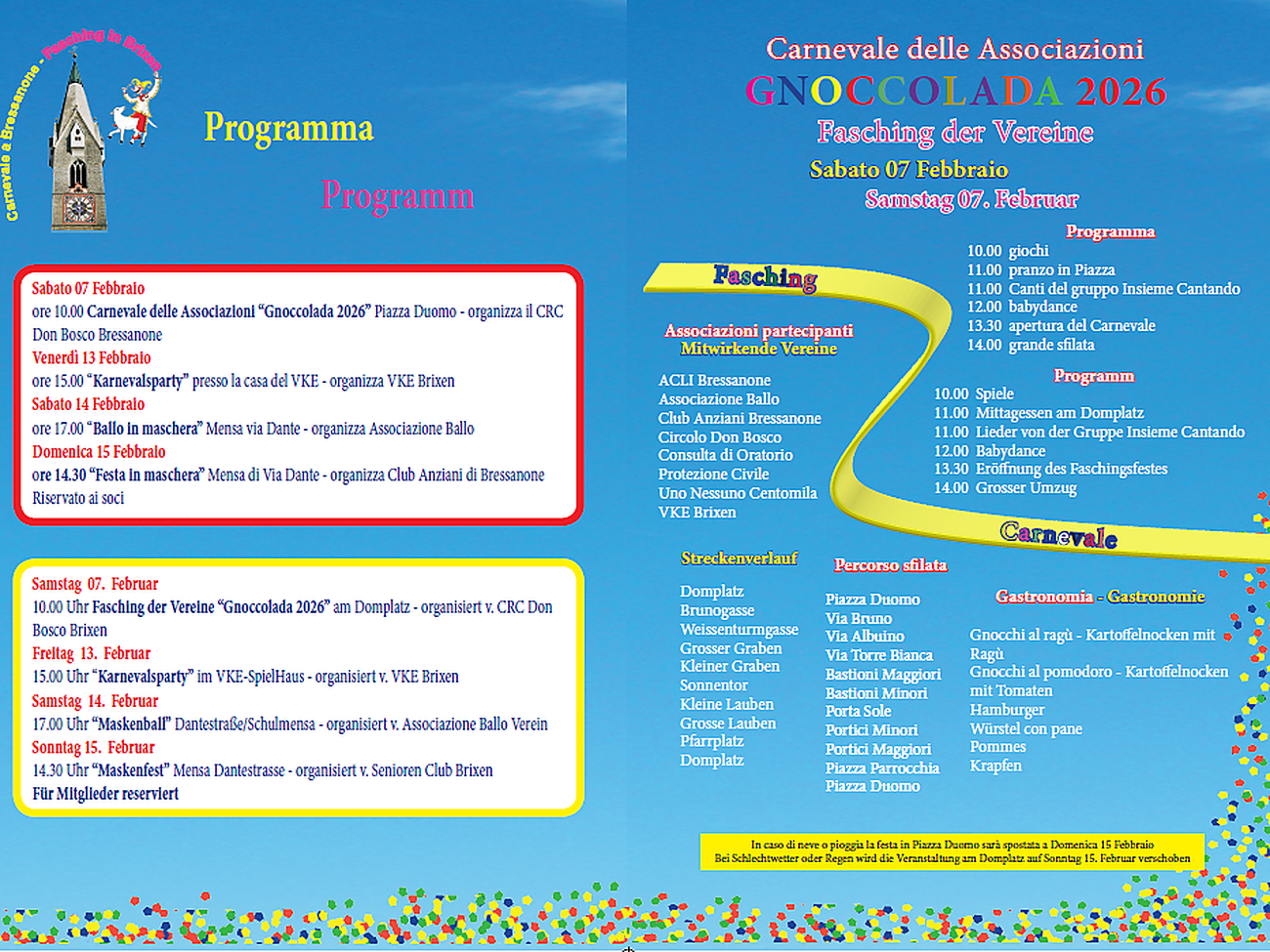 Classico appuntamento con il Carnevale di Bressanone in Piazza Duomo. Il Circolo Ricreativo e Culturale Don Bosco, assieme ad altre 7 associazioni collaborano al fine di portare colore e allegria per le vie del centro storico brissinese e per regalare a grandi e piccini una bella giornata di giochi, divertimento, cibo e musica!