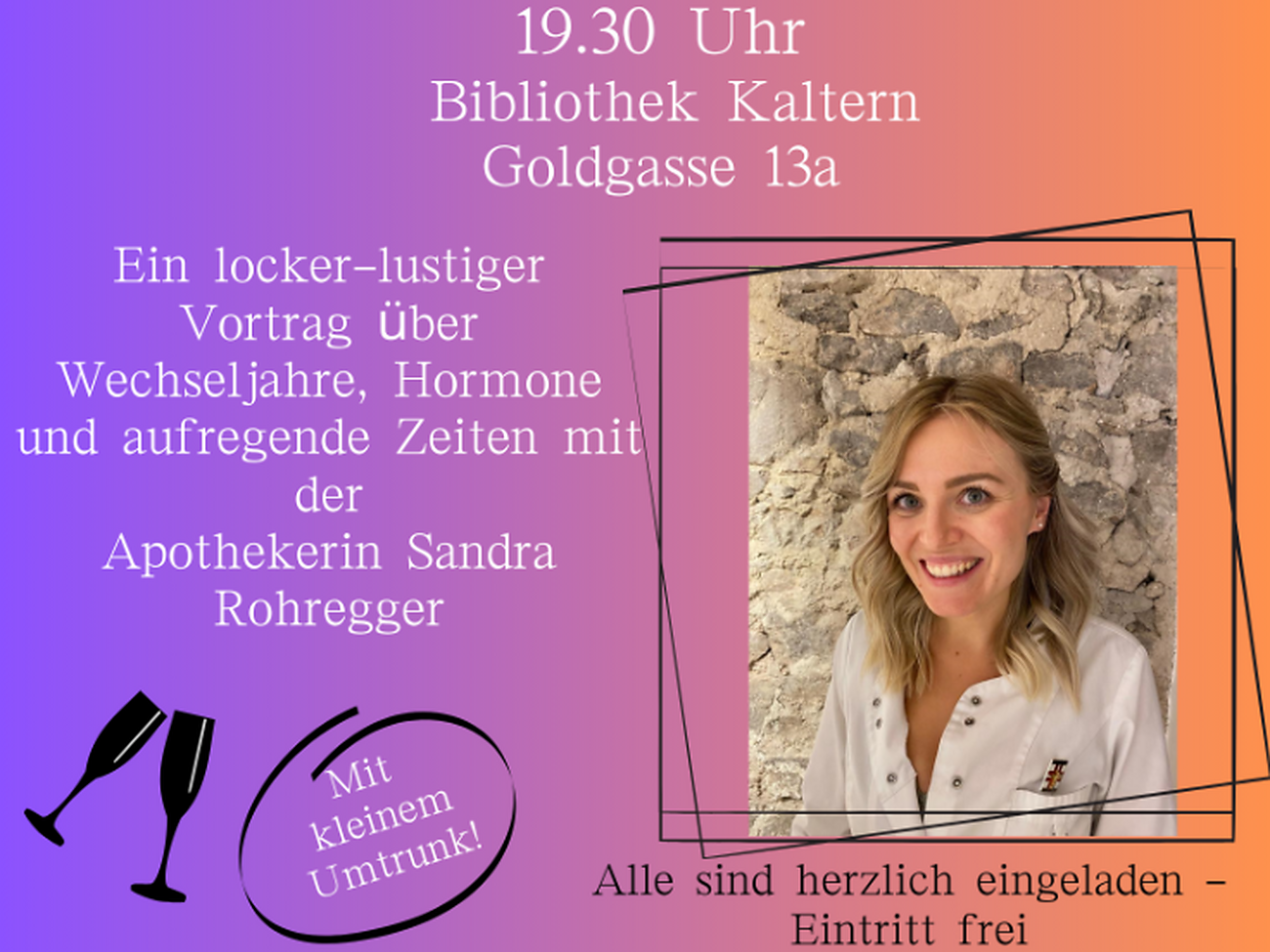 Die Bibliothek Kaltern lädt ein zum locker-lustigen Vortrag über Wechseljahre, Hormone und aufregende Zeiten mit der Apothekerin Sandra Rohregger ein.