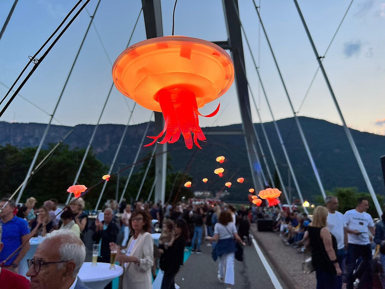 Il ponte di Vadena unisce la quotidianità, ma per una sera diventa protagonista. In occasione del Light+Food+Music Festival la strada verrà chiusa al traffico e la struttura moderna e avanguardista si trasformerà in un vero e proprio palcoscenico. Il ponte prenderà vita grazie a installazioni luminose che si riflettono sull’Adige e avvolgono la struttura in tonalità evocative. Musicisti e musiciste accompagneranno le luci con performance dal vivo, creando un’opera d’arte totale fatta di luce, suoni e movimento.