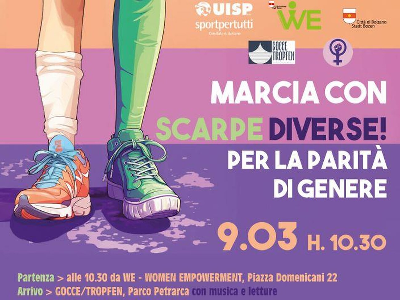 In occasione della giornata internazionale della donna, UISP Bolzano organizza una marcia con scarpe diverse per segnalare quanta disparità di genere ci sia tra uomo e donna.