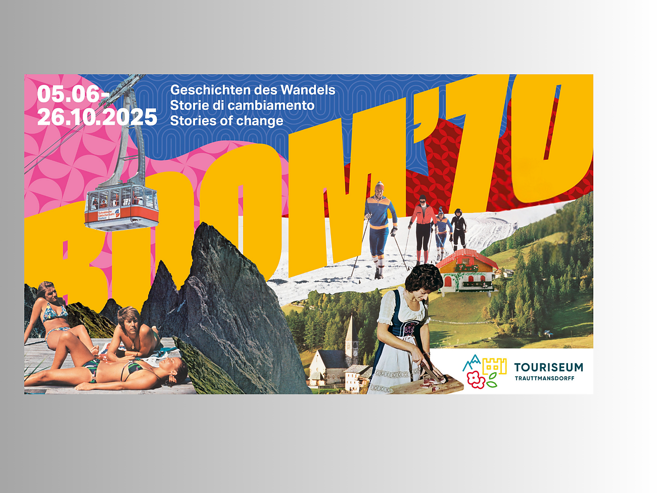 Boom '70 ti porta indietro nel tempo, agli anni del cambiamento e del boom economico in Alto Adige tra gli anni ’70 e ’80. L’ospite moderno arriva ora con la propria auto e raggiunge così anche le zone più remote. Le presenze turistiche esplodono: da dieci a venti milioni – nasce il turismo di massa.