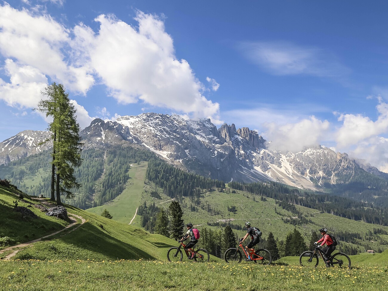 Il tour in e-bike parte dalla malga Frommer e si snoda su trail scorrevoli fino al Passo di Costalunga. Da qui inizia la salita su strade forestali verso la Radura di Mezzo, ai piedi delle Torri del Latemar – qui la montagna sembra davvero a portata di mano. Attraverso trail tecnicamente facili raggiungiamo il versante occidentale del Latemar fino alla malga Laner, dove è prevista la pausa pranzo. Successivamente proseguiamo su piacevoli sentieri fino a Obereggen e infine rientriamo al punto di partenza del tour.