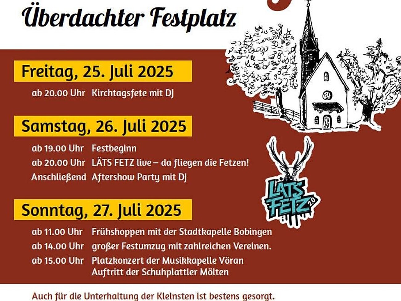 La manifestazione prende il via venerdì sera con una festa animata da un DJ che assicura intrattenimento e atmosfera. Sabato sera il gruppo LÄTS FETZ farà vibrare il tendone, seguito da un DJ che continuerà a far ballare il pubblico.
