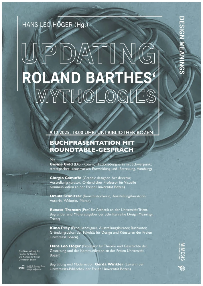 Wie formen Alltagsobjekte, digitale Phänomene und gesellschaftliche Trends neue Mythen? Dieser Frage widmet sich der Sammelband „Updating Roland Barthes’ Mythologies“ von Prof. Hans Leo Höger, der am 9. Dezember um 18 Uhr in der Universitätsbibliothek am Campus Bozen Zentrum vorgestellt wird. Im Anschluss diskutieren Expertinnen und Experten an einem Runden Tisch über Mythen der Gegenwart und die Rolle des Designs im kulturellen Verständnis unserer Zeit.