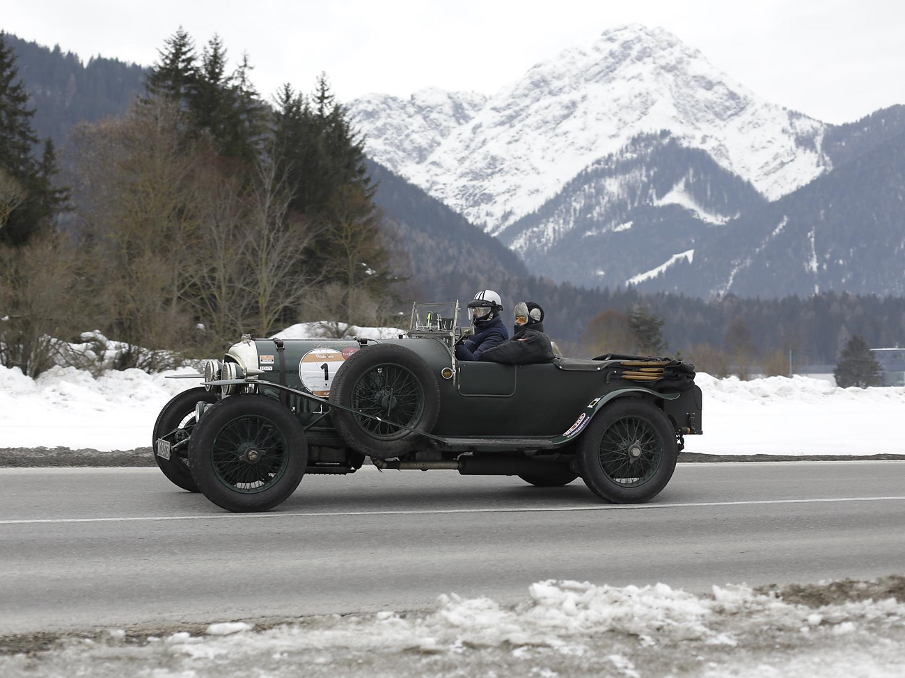 Una gara d'auto d'epoca nel paesaggio invernale innevato.
