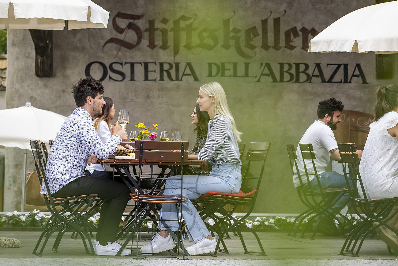 Nella cantina dell'Abbazia offriamo tutti i nostri prodotti: i vini, le grappe, il succo di mela, lo sciroppo di fiori di sambuco e la tisana. Proponiamo inoltre le tipiche merende tirolesi con speck, salsicce affumicate e formaggi, accompagnati da pane sudtirolese della migliore qualità.