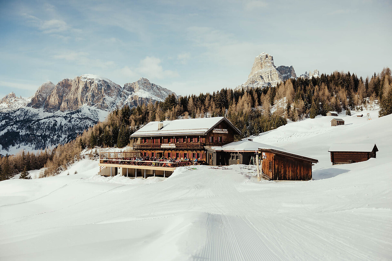 Panorama da sogno vicino Corvara, sulla pista Pralongià. Il rifugio Capanna Nera è annidato in un panorama da sogno nei dintorni di Corvara, situato sulla pista Pralongià e vicino al Golf. Raggiungibile a piedi in 10 minuti. Oltre alle vedute suggestive sulle Dolomiti, il rifugio Capanna Nera offre prelibatezze gastronomiche della tradizione locale, italiana e internazionale. La nostra terrazza solarium invita a trascorrere ore rilassanti in un ambiente magico.
